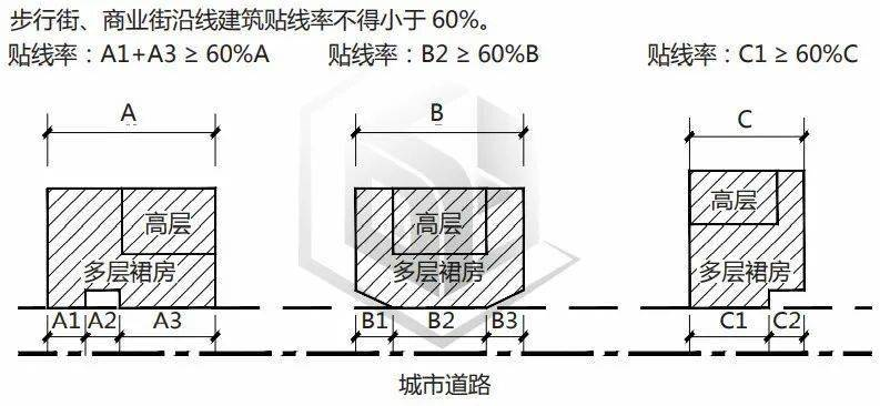贴线率指沿街建筑紧贴建筑控制线的总宽度与总建筑控制线的比值。通透率指的是小区内部空间对外界自然光及新鲜空气的接受程度,也就是沿街贴临城市界面建筑间开敞部分总宽度与总用地红线的比值.