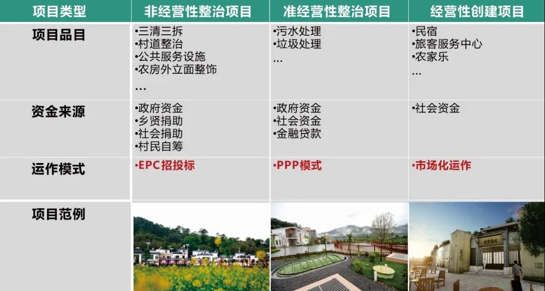 在我们的规划实践中,一般将整治提升项目划分为经营性、准经营性和非经营性三种类型,整县统筹各村庄规划制定的整治提升项目库,进而采用不同方式,协同推进项目实施。