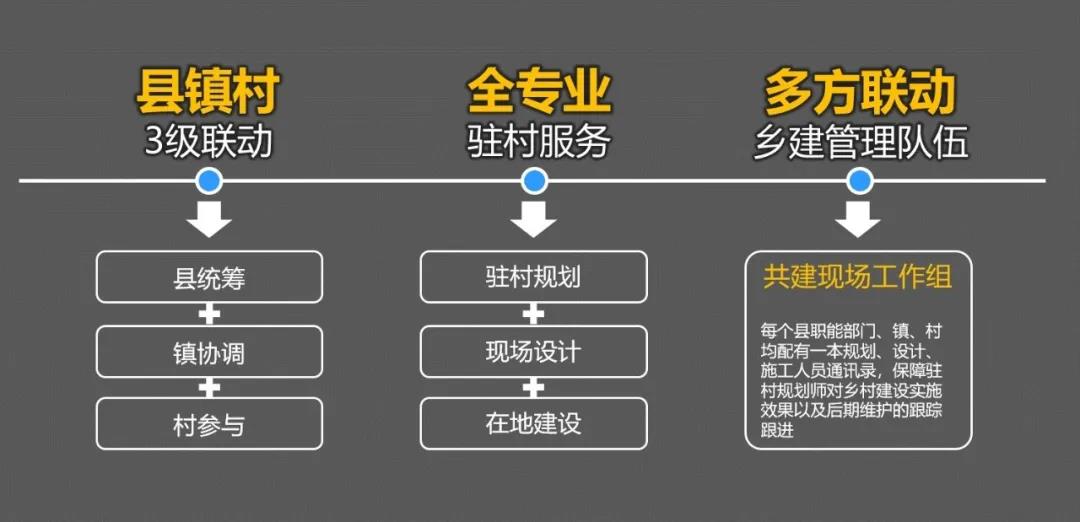 行动流程的一体化重点在于以规划团队为纽带,构建规划、设计、建设、运营等多领域的专业联合团队,同步进场、协同工作,协助地方政府培育县-镇-村三级联动的乡村建设管理队伍。