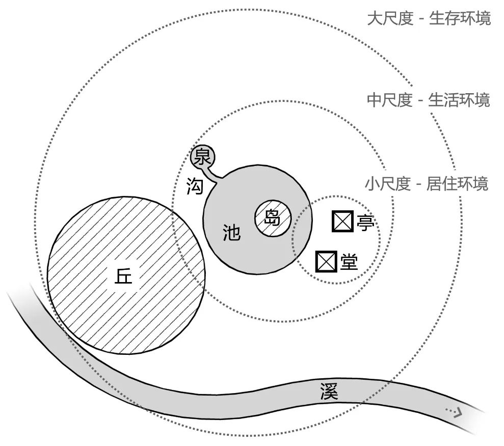 在《愚溪诗序》中,柳宗元详细叙述了他对八愚宅园的构思和营建过程3 。他选取了溪、丘、泉、沟、池、堂、 亭、岛八种要素,来建构他的理想人居。设计中颇多意涵与层次:首先,八个要素各具象征意义。丘、岛象征山,溪、沟象征水,堂、亭象征宅,泉、池象征园。山、水、宅、 园是柳宗元完整人居环境的四个基本范畴,既要满足人的基本物质需求,也要承托高层次的精神诉求。其二,八个要素中强调人工与自然的互补关系。溪、丘、沟、泉属于自然环境,是柳宗元择地的结果。堂、亭、池、岛是人工环境,是柳宗元因形就势、人为创造的结果。自然与人工要素的均衡构成,是柳宗元对人居环境的理解,也是他规划设计的追求。第三,八个要素表现出丰富的层次。溪、丘代表大尺度的生存环境;池、岛代表中尺度的活动环境;堂、亭则代表小尺度的居住环境。不同层次满足不同需求,既分别作用,又构成整体。