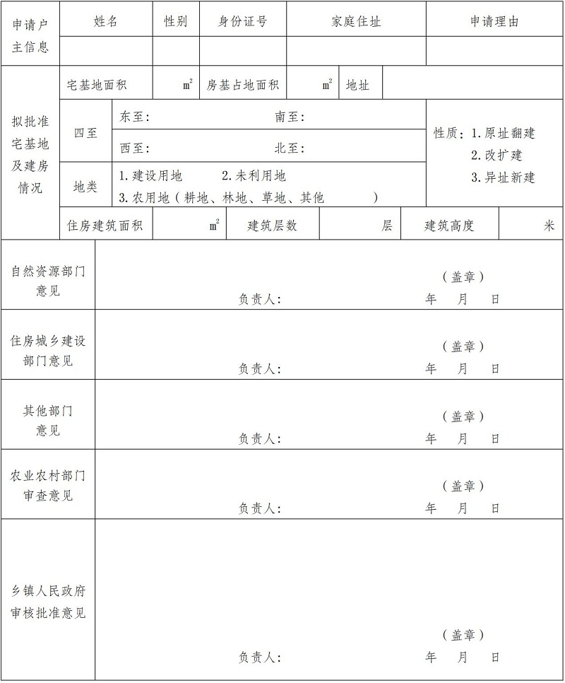 (一)村民申请。村民有建房需求的,应当填写农村宅基地和建房(规划许可)申请表(以下简称建房申请表),以户为单位向村民小组提出宅基地建房申请。