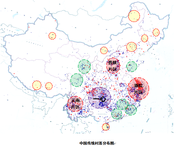 从传统村落在全国的分布情况看,中国传统村落空间结构呈现出“一心、三片、多组团、众特色”的分布特点。