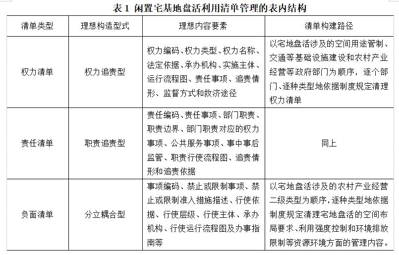 (1)权力清单 宅地盘活权力清单管理的客体主要是市场主体的负外部性行为,包括禁入行为和限入行为,主要为空间用途管制、交通等基础设施建设和农村产业经营等管理行为。比如,宅地盘活涉及的建设用地许可、不动产登记、电力业务许可、客运经营许可、公共场所卫生许可、个体工商户登记、食品生产许可、民宿(农家乐)特种行业许可、建设用地行政处罚、公共卫生行政处罚等行为,涉及的行政管理部门包括农业农村、自然资源、住房建设、电力、卫生、交通、市政、市场监督和公安等。乡村要素配置采取行政许可和行政处罚这种正面清单的方式,容易产生的问题是抑制了市场主体的自由和活力。政府可以在法律规定的清单范围内行使权力,但也只能在清单范围内行使权力,将政府处理公共事物的自由裁量权控制在合理的范围。宅地盘活权力清单构造的责任为消极责任,所以责任事项和追责情形等追责要求应严格按照法律规定进行。为了加强对宅地盘活权力清单的法律约束,按照“有权必有责,权责相适应”的原则,宅地盘活适合的权力清单理想构造型式为“权力追责”型,即“权力事项”+“用权责任”。