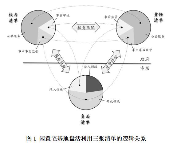 转轨期间,在保障中央政治有效集权和控制改革风险的条件下,中央不断推动向地方和向市场进行经济分权。中央通过面向经济发展绩效考核的官员晋升制来充分调动地方发展经济的积极性,通过产权改革来形成市场主体的激励约束机制。政治市场和经济市场的激烈竞争保障了我国经济的高速增长。但出于宏观调控的需要,反复出现中央向地方和市场的经济分权与收权的摇摆,中央与地方、市场与政府的边界处于模糊不清的地带。党的十八大以来,中央试图通过清单制的制度创新来落实简政放权和法治政府建设的政治目标,推动政府职能转变。十八届三中全会提出,“推行地方各级政府及其工作部门权力清单制度,依法公开权力运行流程”。2015年3月,中办和国办联合发布权力清单制度指导意见。同年12月,国办印发权力和责任清单编制试点方案,确定在发改委等7部门开展试点,并规定未列入试点的部门,可参照预先执行。2015年10月,国务院发布市场准入负面清单制度意见,同年12月正式公布全国第一版市场准入负面清单。通过以上制度文本分析可以发现:清单管理的政策内涵是将技术治理的理念引入政府管理,在技术治理科学理性的指导下,实施科学管理和专家治国两大原则,促进政府职能转型,构建现代服务型和法治型政府。通过对政府权力的确权、晒权和控权,一方面增强各级人民政府对人民需求的回应,另一方面增强政府管理公共事务的效率,具有行政管理正义和效率的双向维度。权力清单是指按照“法无授权不可为”原则,通过清单详细列出法律向政府授予的实施行政许可、行政处罚等行政行为的行为规则,并向社会公开,其目标是塑造“有限政府”,解决政府用权任性、“乱作为”问题。“责任清单”是指按照“法定职责必须为”的要求明确政府职责、明晰职责边界,其目标是建设“责任政府”,以清单的形式明确政府必须提供的公共服务职能,主要解决政府逃避责任、“不作为”的问题。负面清单是按照“法无禁止皆可为”原则,给企业“松绑”,向市场放权,其目标是建设“有效市场”。综上,宅地盘活实施清单管理是落实中央转变政府职能和实施乡村振兴战略必不可少的改革内容。由于中央开展两项改革的时间还比较短,宅地盘活的制度建设中清单管理的内容还比较薄弱,各项制度还不够成熟,需要进一步根据中央的要求和实践的情况深化制度建设。