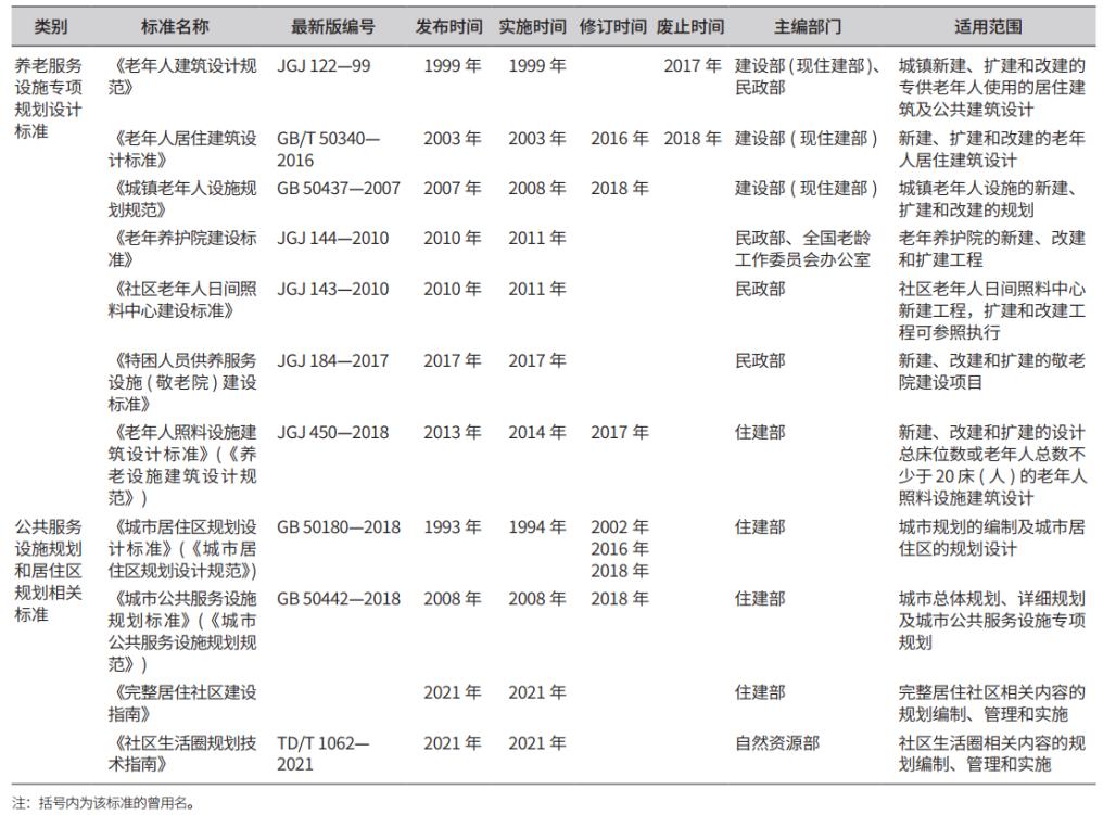 2011年,国务院发布《社会养老服务体系建设规划(2011—2015年)》,明确提出我国养老服务体系应当由居家养老、社区养老和机构养老三部分组成,尤其强调了社区居家养老服务的重要地位。为健全我国基本养老服务体系,行政主管部门陆续出台了一系列针对社区居家养老服务设施的国家标准和行业标准。2010年,民政部出台了我国首部针对社区养老服务设施的行业标准——《社区老年人日间照料中心建设标准》(JGJ 143—2010)。2018年,住建部修订了《城市居住区规划设计标准》(GB 50180—2018),调整居住区分级规模,建立三级生活圈,对养老服务设施的等级和服务范围做了新的规定。随后,住建部对《城镇老年人设施规划规范》(GB 50437—2007)进行了局部修订,将设施分级调整为符合15分钟和5分钟生活圈居住区常住人口规模的服务规模等级。2021年,自然资源部编制了《社区生活圈规划技术指南》(TD/T 1062—2021),从规模性、覆盖性、效率性和品质性4类指标对养老服务设施在不同类型社区生活圈中的规划建设提出明确要求;同年,住建部编制了《完整居住社区建设指南》,对5分钟、10分钟生活圈内的养老服务设施(如老年服务站)的建设要求、建设原则和功能布局提出明确指引。