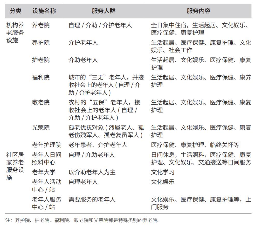 现行标准对我国现有的大部分养老服务设施的规划设计做出指引,这些设施覆盖了全龄段各类别的老年人群体。其中,老年人照料设施相关标准对服务对象的健康状况层次有较为明确的规定,如老年护理院以介护老年人为主要服务对象,护老院主要服务于介助老年人。通过照料设施的分层分类,我国构建起覆盖全龄段和各种健康状况老年人的专业化的老年人照料体系。不同于照料设施,大部分文体活动设施和综合养老服务设施(如老年服务中心)面向所有老年人,对服务对象的年龄和健康状况没有特别的规定。