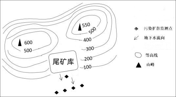 污染扩散监测点:在垂直地下水流向的尾矿库两侧30-50m处至少各布设1个土壤及地下水监测点位,在地下水流向下游30m、50m、70m处至少各布设1个土壤及地下水监测点位,金矿尾矿库需酌情增加。
