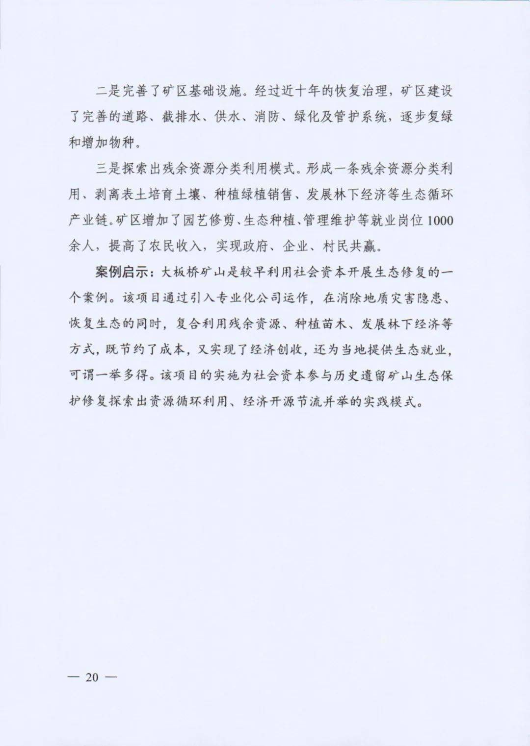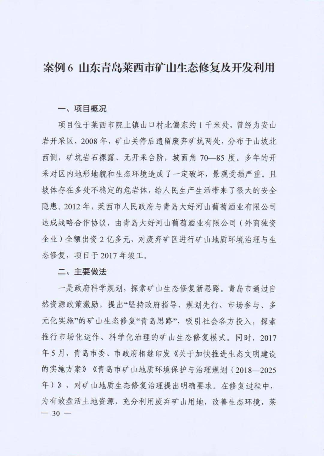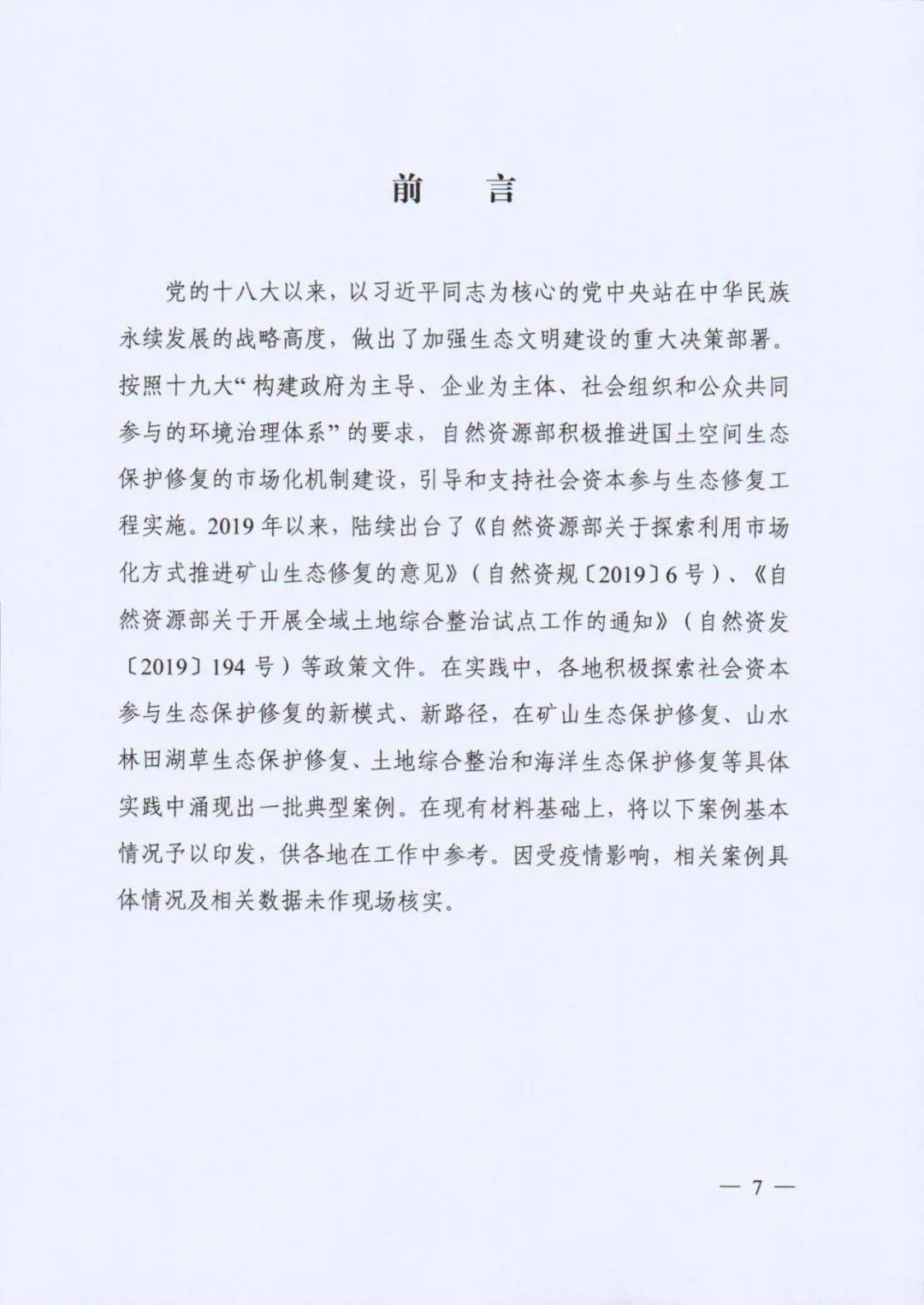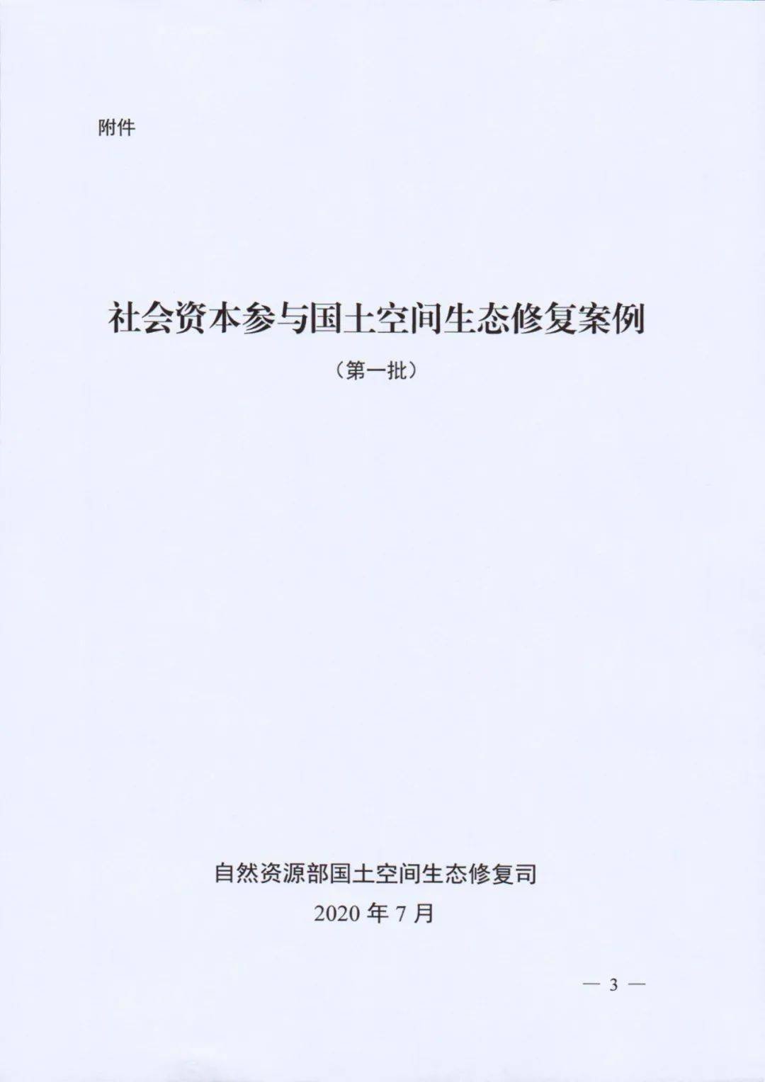 2019年以来,陆续出台了《自然资源部关于探索利用市场化方式推进矿山生态修复的意见》(自然资规〔2019〕6号)、《自然资源部关于开展全域土地综合整治试点工作的通知》(自然资发〔2019〕194号)等政策文件。在实践中,各地积极探索市场化运作、科学性修复、开发式治理,摸索出一些社会资本参与生态保护修复的新模式、新路径、新做法,涌现出一批具有推广和借鉴作用的典型案例。近日,自然资源部印发《社会资本参与国土空间生态修复案例(第一批)》(以下简称《案例》)。