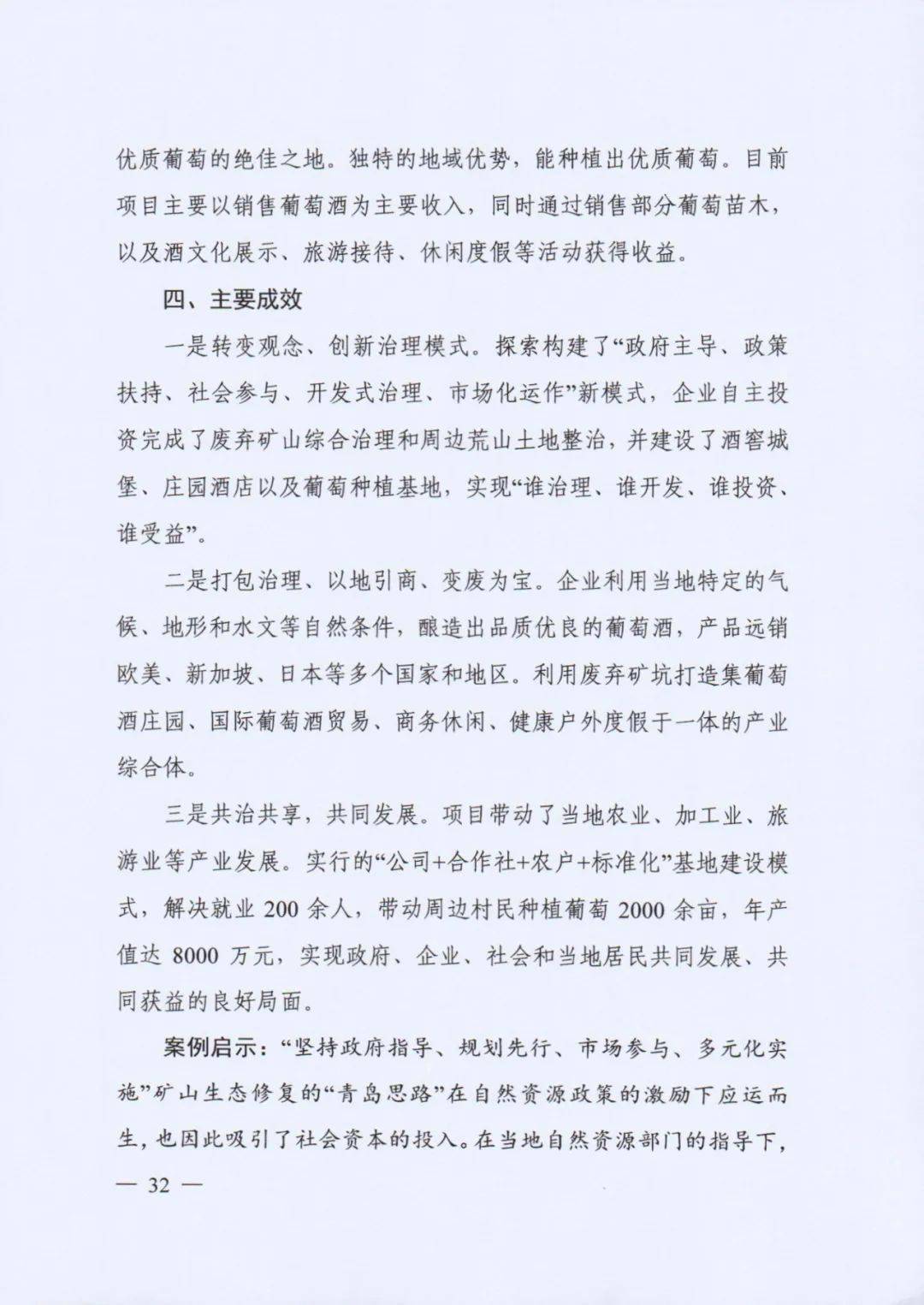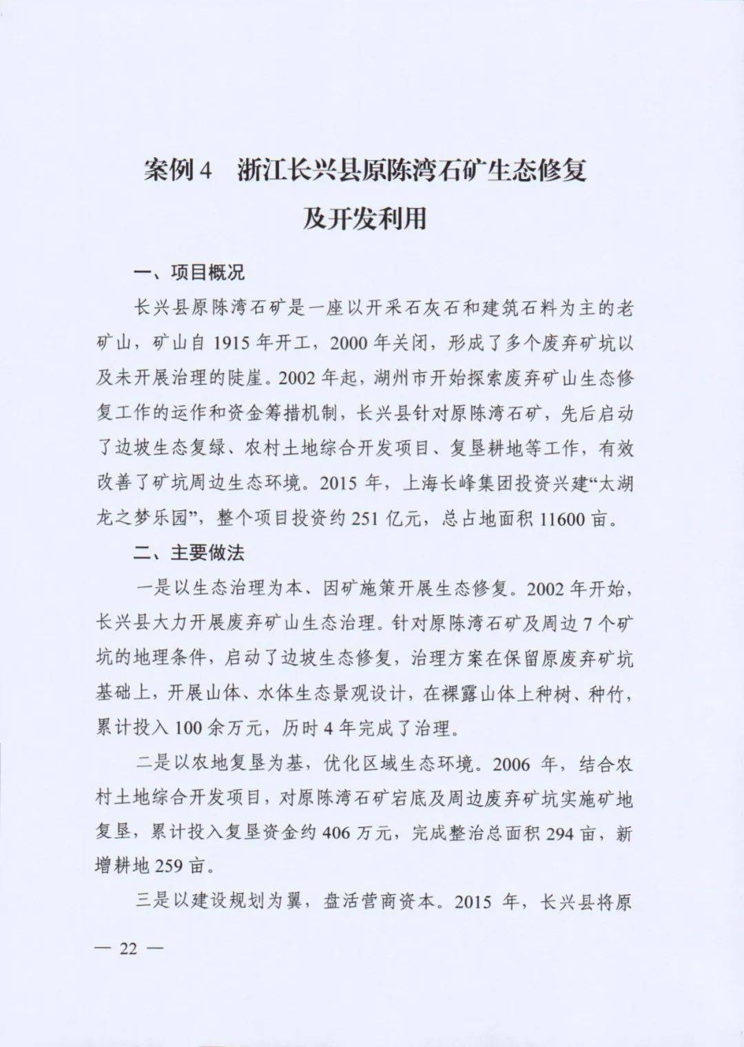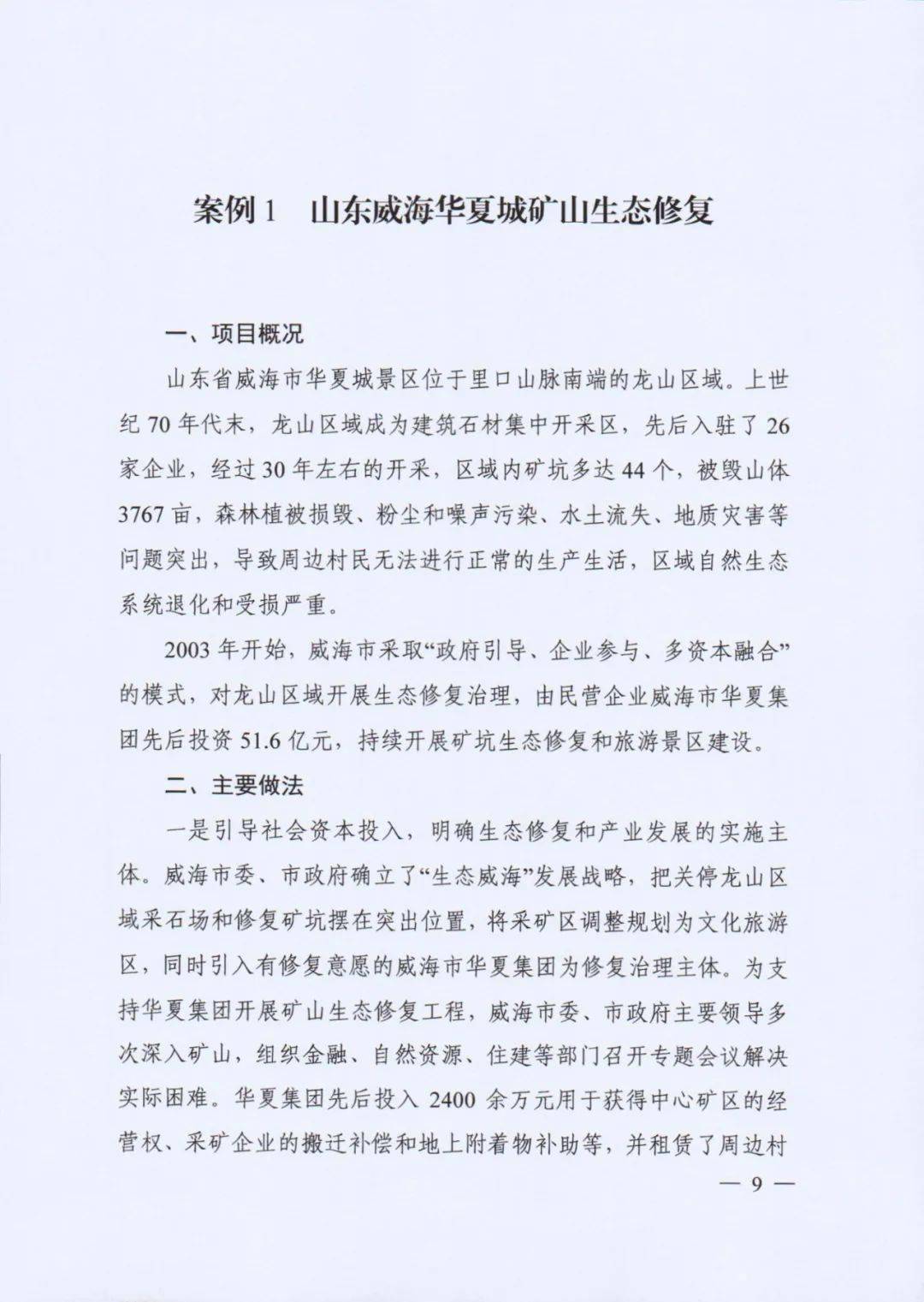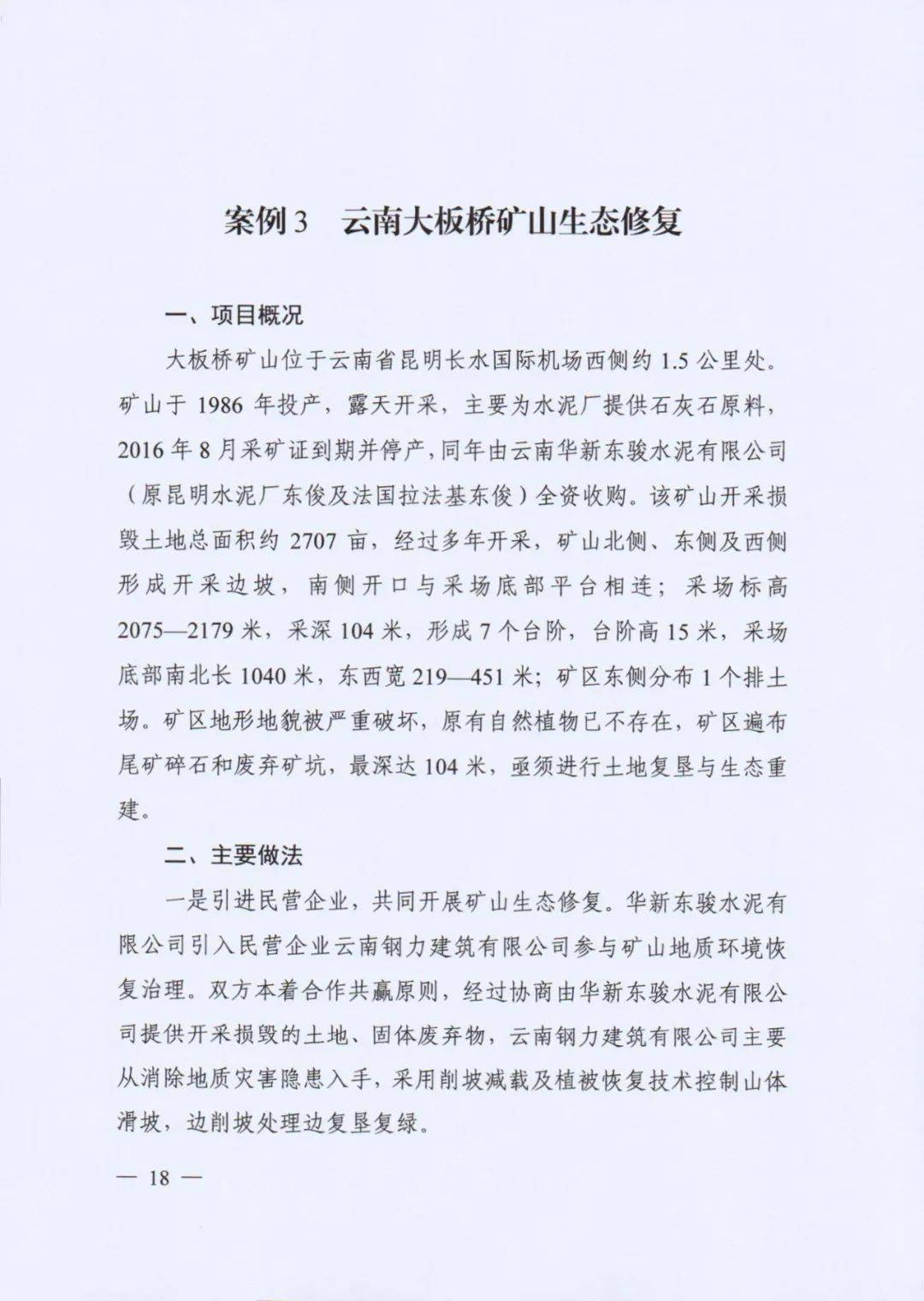 2019年以来,陆续出台了《自然资源部关于探索利用市场化方式推进矿山生态修复的意见》(自然资规〔2019〕6号)、《自然资源部关于开展全域土地综合整治试点工作的通知》(自然资发〔2019〕194号)等政策文件。在实践中,各地积极探索市场化运作、科学性修复、开发式治理,摸索出一些社会资本参与生态保护修复的新模式、新路径、新做法,涌现出一批具有推广和借鉴作用的典型案例。近日,自然资源部印发《社会资本参与国土空间生态修复案例(第一批)》(以下简称《案例》)。