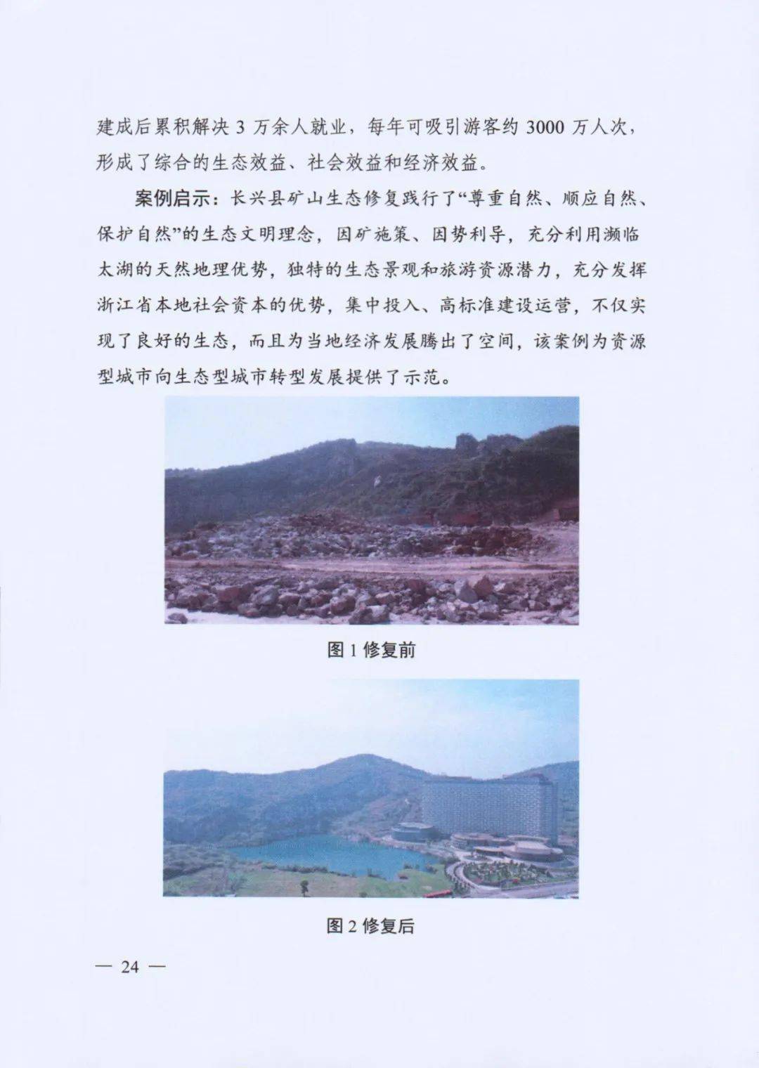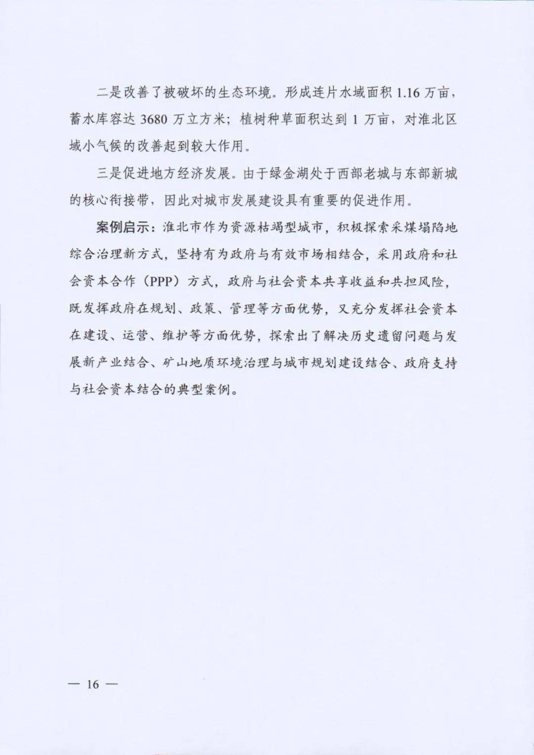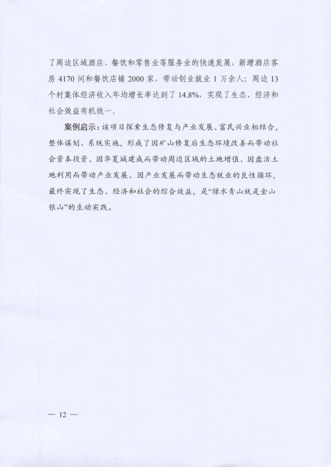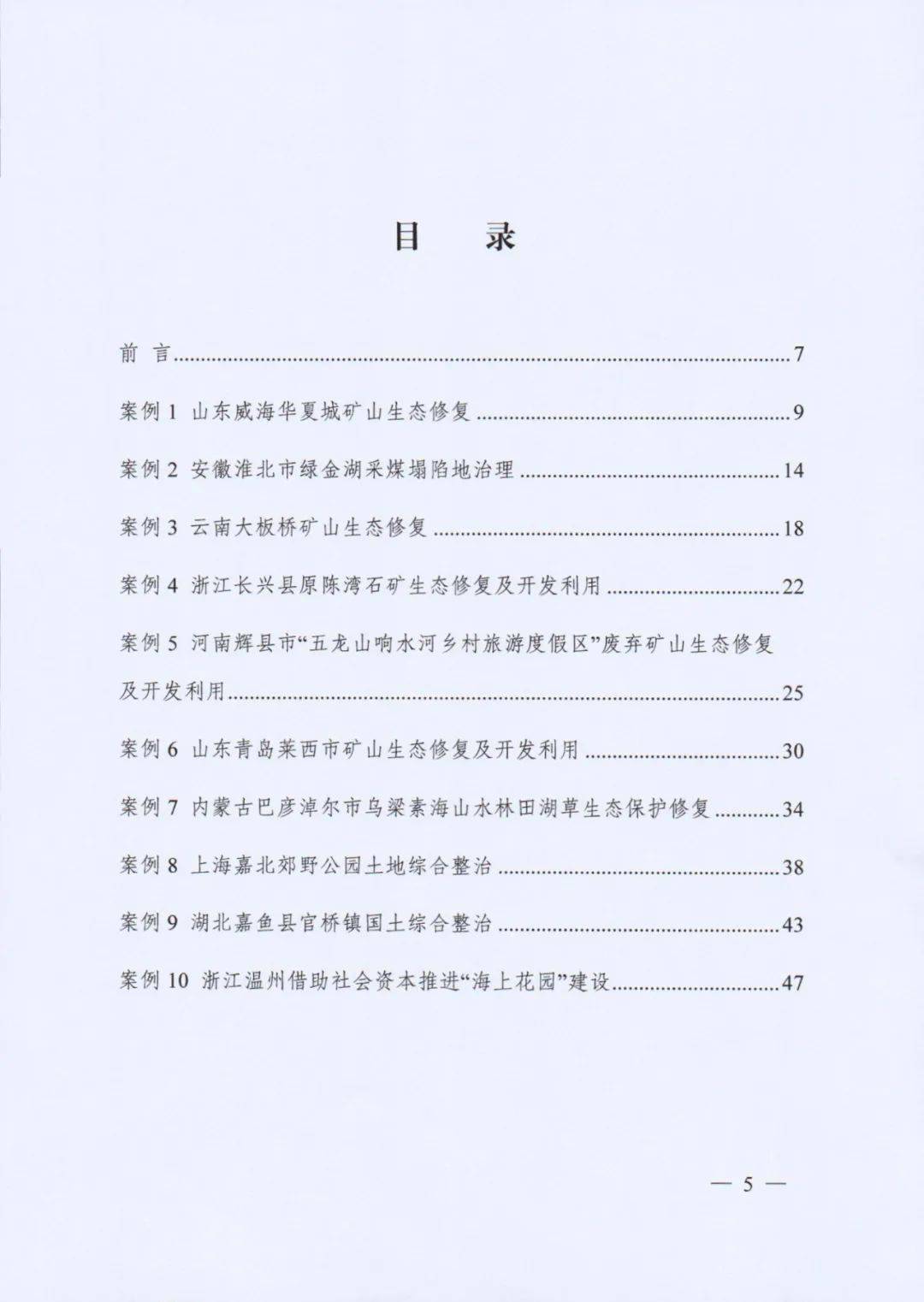 《案例》收集了社会资本参与矿山生态修复、山水林田湖草生态保护修复、土地综合整治和海洋生态保护修复四种类型共10个案例,重点介绍主要做法、运作模式和实际效果。10个案例中,包括以生态修复改善生态环境带动社会资本投资、政府和社会资本合作共建、生态修复与城市建设发展结合、生态修复与脱贫攻坚融合、生态修复带动旅游业发展等生态保护修复的模式,发挥了良好的生态效益、经济效益和社会效益。