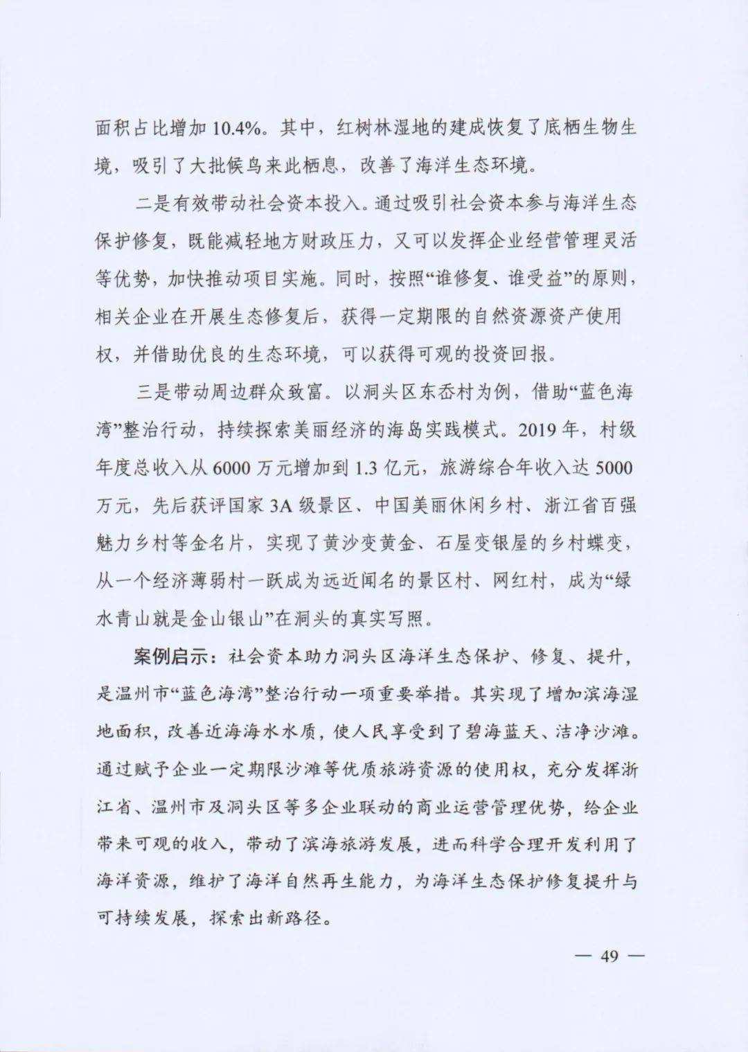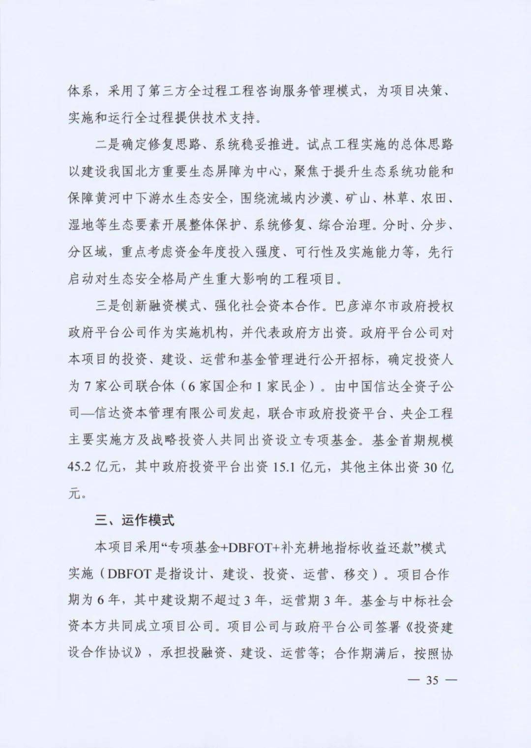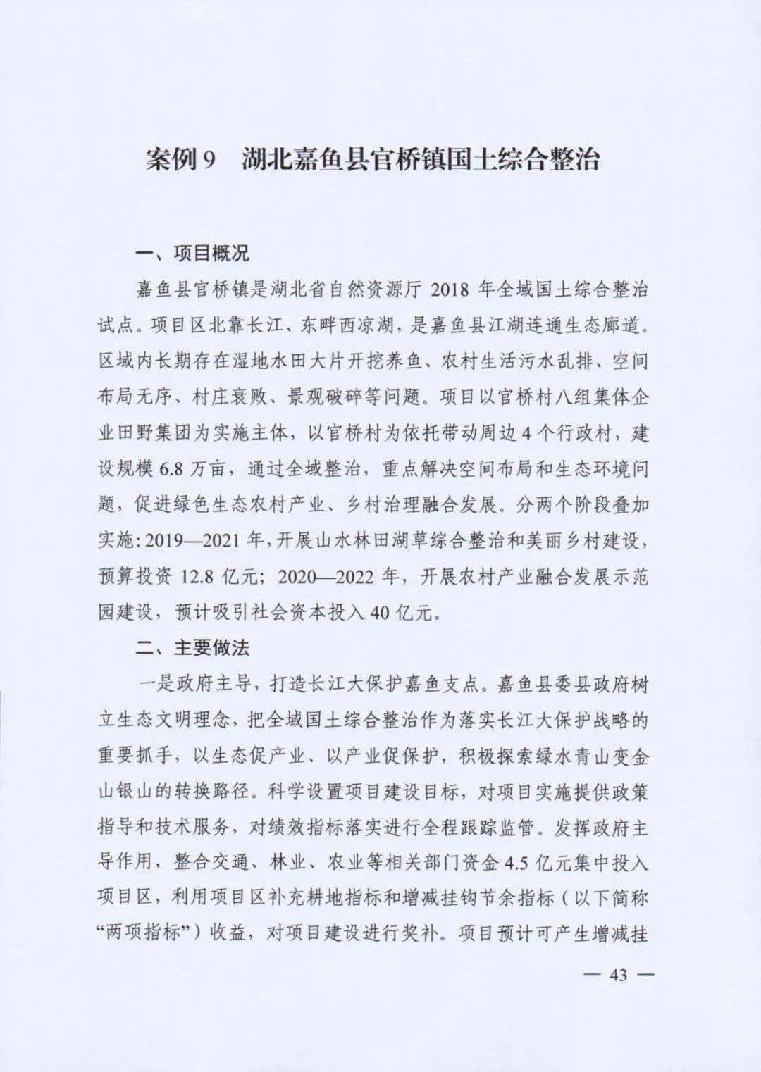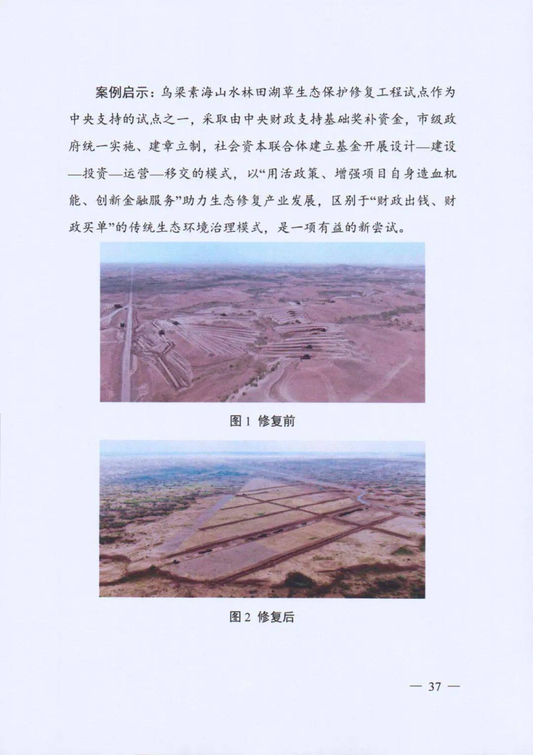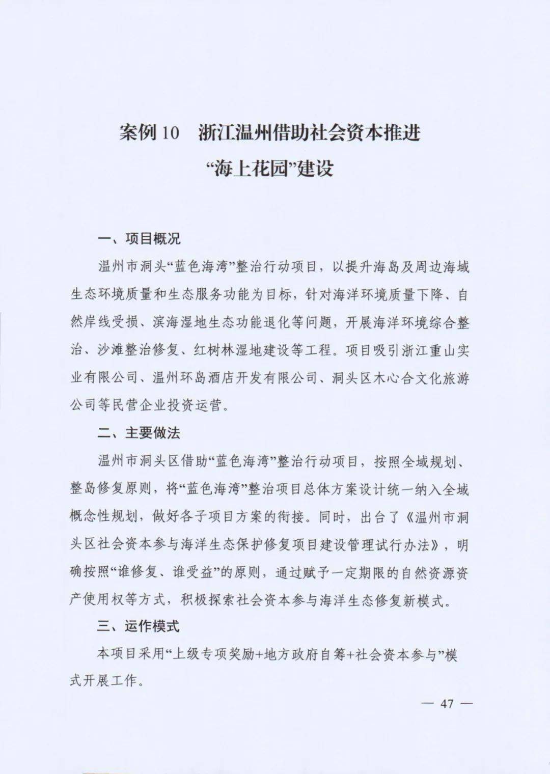 《案例》收集了社会资本参与矿山生态修复、山水林田湖草生态保护修复、土地综合整治和海洋生态保护修复四种类型共10个案例,重点介绍主要做法、运作模式和实际效果。10个案例中,包括以生态修复改善生态环境带动社会资本投资、政府和社会资本合作共建、生态修复与城市建设发展结合、生态修复与脱贫攻坚融合、生态修复带动旅游业发展等生态保护修复的模式,发挥了良好的生态效益、经济效益和社会效益。