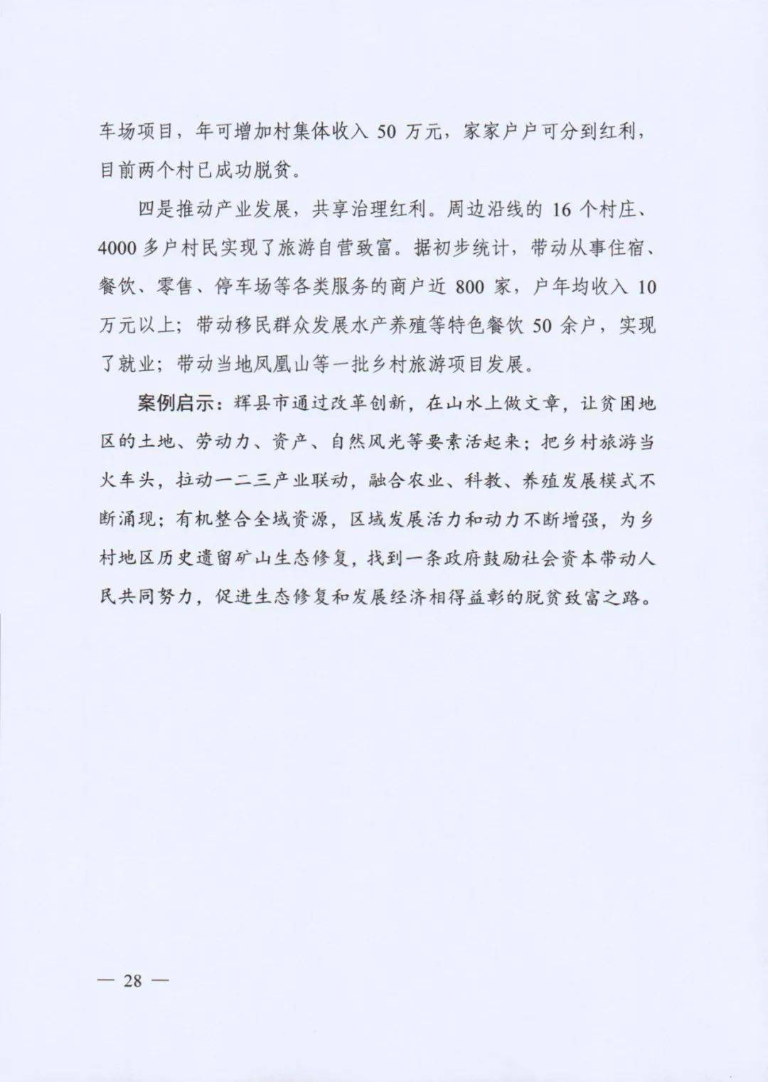 这些案例的共同特点是,认真贯彻落实习近平生态文明思想,努力践行“尊重自然、顺应自然、保护自然”的生态文明理念,坚持问题导向和目标导向,立足当地实际,因势利导、因地施策,积极探索鼓励和吸引社会资本参与生态保护修复的新路子,形成了一个个“绿水青山就是金山银山”的生动实践。