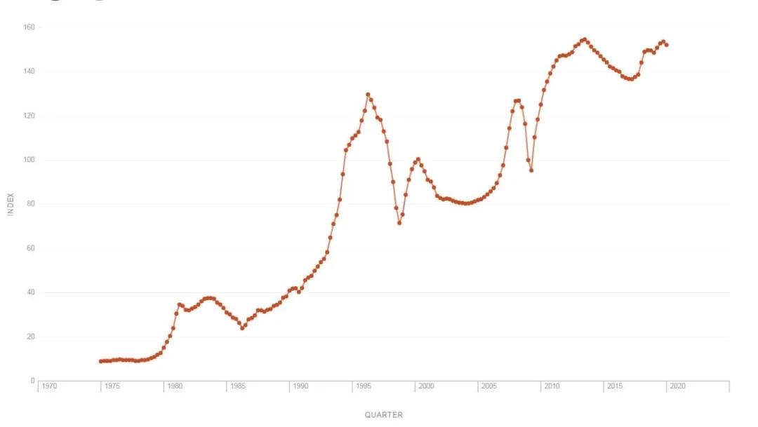 1975-2020年,新加坡的住房价格指数平均年增长率为6.5%,1975-1996年的平均年增长率为13.6%,而1996-2020年的平均年增长率0.7%,可见土地增值在城市化初期尤其显著。在1975-1996年间,只有80年代初期因经济结构调整,导致住房价格下降。1996年后,新加坡接连遭受1997亚洲金融危机和2008世界金融危机,房地产周期性明显加剧,住房价格四次暴跌,房地产经济受到严重打击。1996年之后,新加坡的房地产风险提高,而在此之前几乎没有风险。