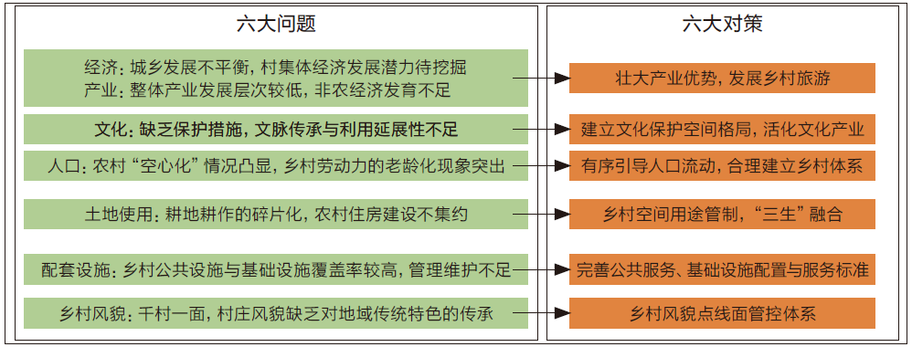 根据村民访谈问卷的整理,结合实地的走访踏勘,总结归纳出西海岸新区乡村地区的六大问题,并提出相应的六大策略(图 4),包括壮大乡村产业、文化保护与利用、乡村体系、乡村用地空间、完善设施配套、乡村风貌管控等内容,后四项是实施管控与建设层面的主要内容。