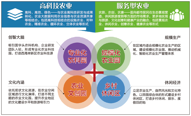 青岛西海岸新区实践尝试从不同的角度体现城乡融合理念,具体包括产业、交通、设施、政策等方面。对新区城乡整体的产业特点进行把握,提出城区与乡村产业融合发展的思路,着力夯实三大基础农业产能,与城市互动、延展传统农业链,培育形成“高科技农业、服务型农业”的产业发展模式(图 7),提出乡村地区重点发展的五大高效特色产业,推动三产融合、产村融合,以现状特色种植划分乡村地区的产业导向(图 8);