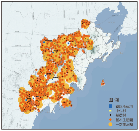 促进城乡公共服务设施与基础设施均等化,考虑不同设施所服务人口规模的差异性,构建“区级—街道乡镇级—中心村级—基层村级”四级生活圈,通过对地形、交通、水系等影响因子的分析,修正生活圈(图 9),差异化配置公共服务设施,并对各镇村的公益型和市场型设施提出不同的落位与配置内容;