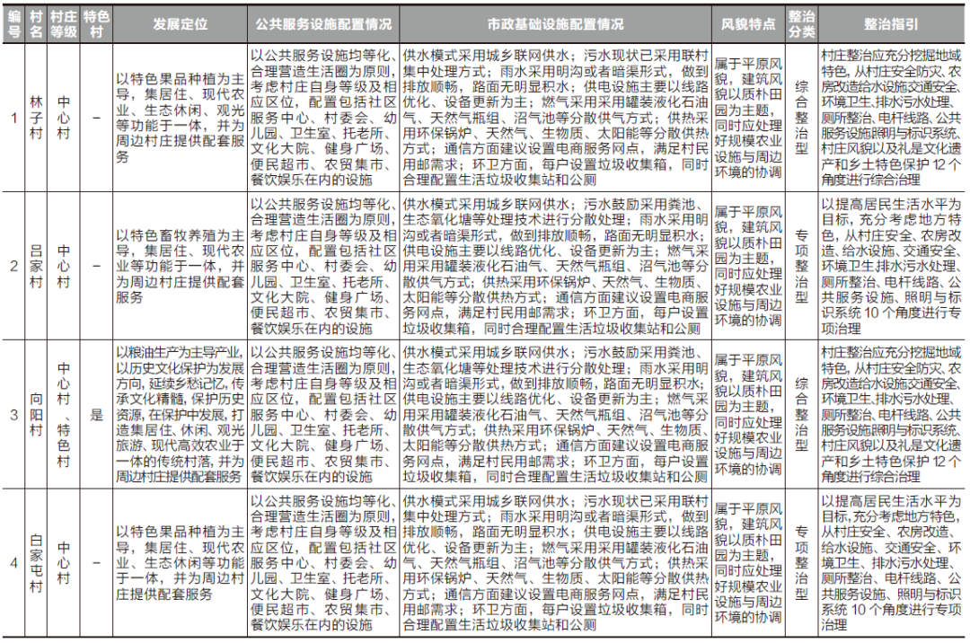 “一表”指对各镇街村庄的等级、是否特色村、村庄发展定位、设施配置要求、村庄整治指引、风貌控制等提出详细的要求(表 1)。
