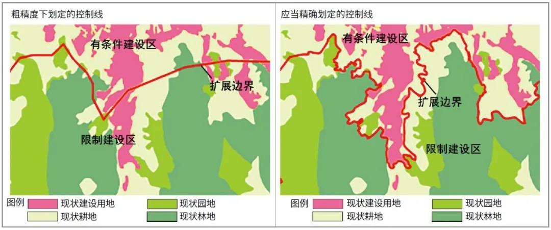 因此,整个土地利用规划体系是在较大的空间尺度下,围绕如何实现建设用地总量不突破、耕地总量不减少、基本农田不被侵占和生态空间不被破坏等内容进行运作。这一运作方式在各类空间指标控制的要求上,与城乡规划体系的建设空间规模存在一定矛盾;在刚性控制线的管理上,又由于对未来城乡发展方向的研判不足或大尺度下划定各类用地的精度问题(图1),常使实际开发和客观现状发生一定冲突。