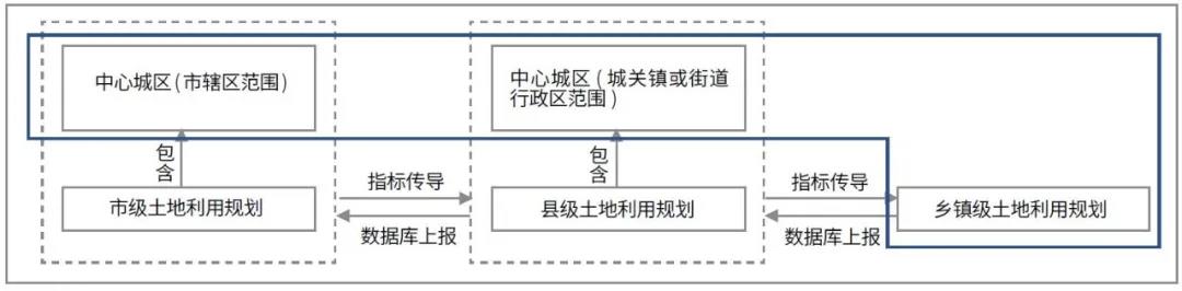 建设用地、耕地等规模指标的控制和安排是土地利用规划的重要任务,整个规划体系通过自上而下的任务分解和指标传导来实现这一任务目标。土地利用规划体系层级从地级市层面向下,一般包含市、县、乡镇3级。在规划编制时,市级层面将指标任务分解传导至各区县市,同时对中心城区范围(一般为市辖区范围) 进行详细布局;县级层面在接收上一层级规划任务后,进一步将指标任务传导分解至各街道乡镇,并对中心城区范围(一般为城关镇或街道行政区范围)进行详细布局;乡镇级层面对其辖域内的空间进行详细布局。各层级规划编制完成后,建立数据库,自下而上层层上报,最终形成全域的完整拼图。