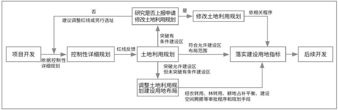 项目开发前期首先依据城乡规划,将项目红线反馈给土地利用规划,若红线突破建设用地范围但仍在有条件建设区内,则可通过农转用、耕地占补平衡等审批程序和规划手段实现用地布局调整。若红线突破有条件建设区,则土地管理部门会根据项目的重大程度决定是否上报进行规划修改;若无法修改,则会要求项目调整红线或另行选址。可以看到,在程序上城乡规划起到了指引开发建设的作用,而土地利用规划出于土地资源保护的目的则起到了审核与配合的作用,即“城乡规划许可”在先、“建设用地审批”在后(图4)。