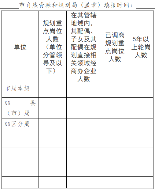 (十三)严格规划重点岗位人员管理。省、市、县自然资源主管部门要对规划编制、审批、许可等重点岗位公职人员进行全面摸排,在其管辖地域内,发现其配偶、子女及其配偶在规划直接相关领域经商办企业的,必须调离现岗位;在规划重点岗位任职5年以上的应当轮岗。各设区市自然资源主管部门于2021年1月底前将摸排处理情况统计表反馈省厅(见附件)。