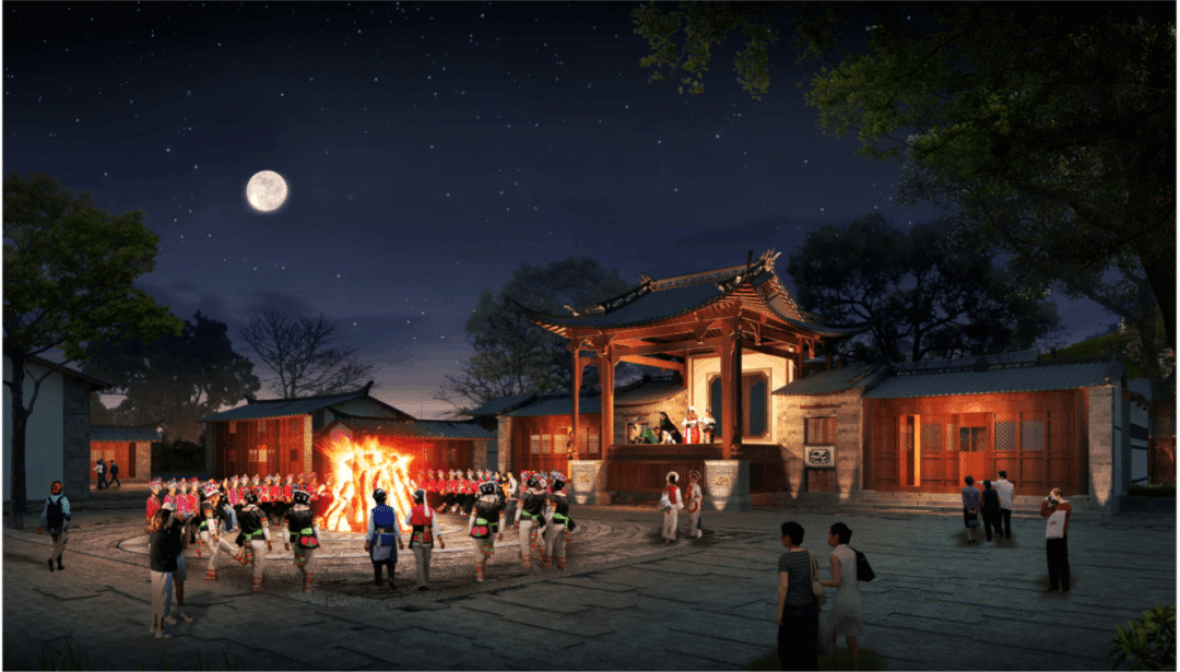 民族情——以传统大院、特色街巷、广场戏台及其它村落公共空间为载体将白族的音乐、舞蹈、特色美食、节庆等非物质文化进行集中展示,凸显浓郁的白族风情。