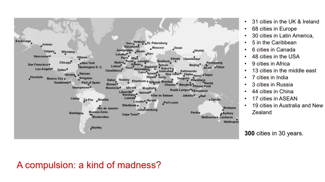 在过去的30年里,我到访了300个城市。 某一天,当我自己思考着,为什么要用30年的时间走访300个城市的时候,我迎来了“尤里卡”时刻。一部分原因在于,“城市的世纪”是充满魅力的,我非常渴望了解它的含义以及运作方式。另一部分原因在于,我对那些用于描述或衡量城市的指标不再充满兴趣,例如连通性、土地利用、竞争力、宜居性、生活质量等。我开始慢慢审视这300个城市,将它们视为独立的个体。它们每一个都有自己的特点,以及自己的组织方式。由于这些独特之处,与城市相遇的过程开始变得迷人,就像遇见更多的人一样。