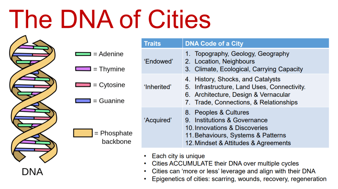 城市DNA的理念是,如果我们了解这12类要素的特别之处,就能理解到,它们如何通过组合使城市变得独特。同时也能明白,一个城市如何在多个发展周期中积累DNA。城市会与其DNA产生共鸣,并在一定程度上与其保持一致。城市可以用最佳的方式利用自己的DNA,也可以选择忽略它们。同时,城市也可能会经历类似于“表观遗传学”的过程:例如出现一些“疤痕”或者“伤口”,并在恢复及再生的过程中实现自我进化。