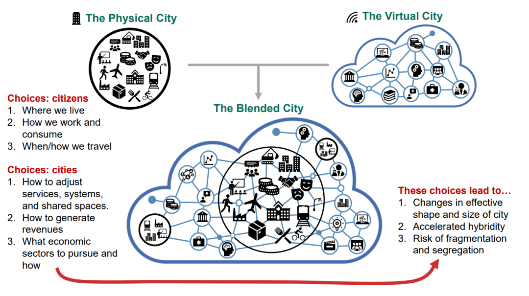 此外,它一定程度上赋予了人们关于城市运作方式的新思路。这并不是指人们要离开实体城市并走向虚拟城市,而是指我们将迎来新的混合型城市。城市居民和城市之间的关系可能发生改变,人们会对居住地点、工作及消费方式、以及何时、如何出行做出新的选择。与之前相比,城市边界的渗透性会变得更强,地理范围比之前更大。同时在土地利用、基础设施和其他方面都有更多的选择。正如之前所说, 疫情带来的不是城市化的逆转,而是要求城市以更灵活的方式进行应对。