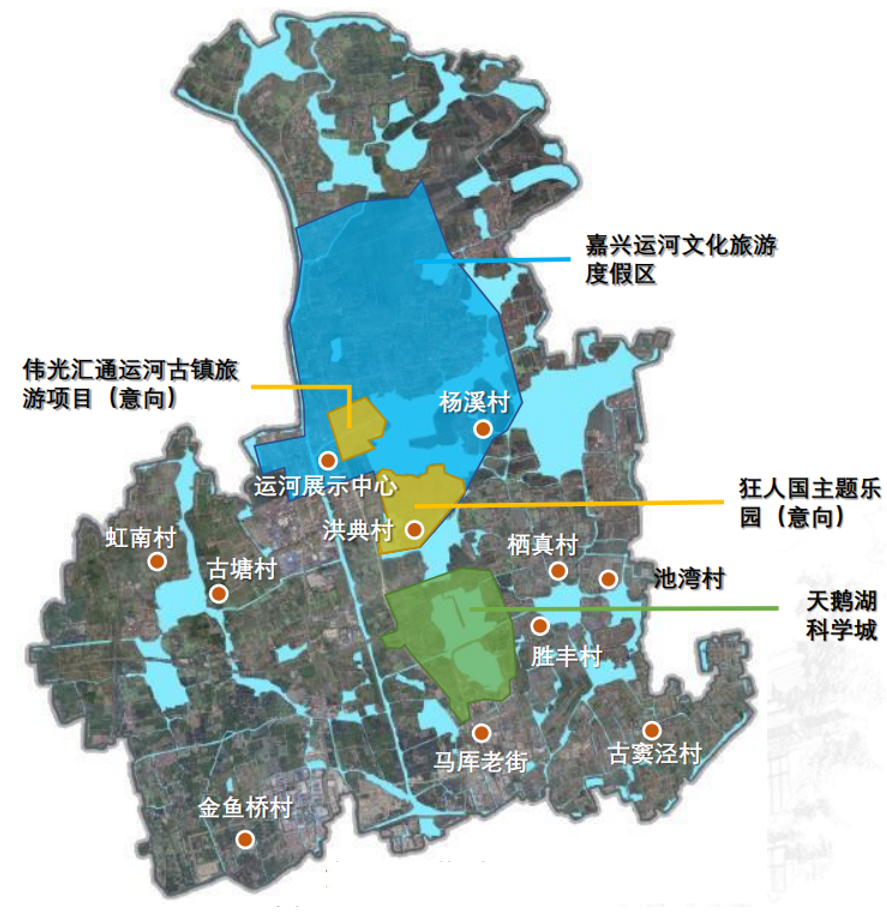 从生态区位来看,秀洲区位于太湖的东南部,与上海、嘉兴、嘉善以及苏州的部分区市共同组成了长三角生态绿色一体化示范区。因此湖荡区应充分发挥生态资源与地缘优势,积极融入示范区多中心、网络化的空间格局,形成功能和风景融合的示范,通过高质量的产业的导入形成科技创新和三产融合的示范,包括城乡协调发展的示范,共建绿色生态示范。同时,远期发展还包括乡村水环境空间保护与营造,以及进一步的对江南特色水乡进行申遗等,作为文化战略上的考虑。