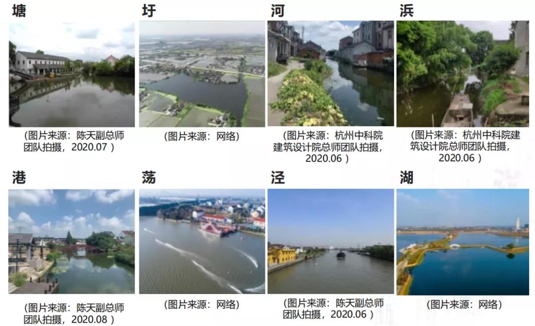 得益于3000年的水乡文化历史,规划区内很多文物和遗产已得到一定的发掘和利用。未来在水乡的文化遗产展示上,可能要进行一个整体的塑造,包括设立专题串联水文化的空间载体和水文化精神传承等等。各种类型的水乡空间样本也可以作为一个地理文化空间的综合形式来展示。湖荡区集合了塘、圩、河、浜、港、荡、泾、湖等多种水体类型(见图7),都是构成江南水乡的重要特质,应进行整体上的文化保护和地理空间重构。包括历史上的比较有名的一些江南水乡的文化地域,水乡的文化底蕴也会通过风味小吃等非物质遗产来体现,水乡地区未来也可能会跨区域申报世界文化遗产。