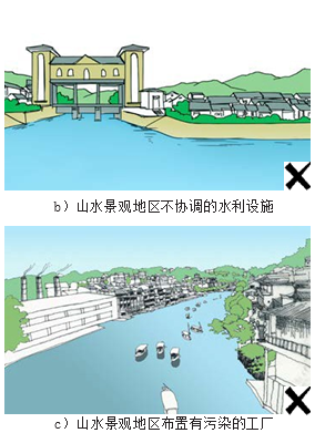 在沿山滨水景观地区应避免出现与景观环境不协调的土地用途以及建筑物、构筑物。
