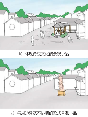 小城镇的街道家具, 如景观小品、座椅、指示牌、路灯、垃圾桶、地面铺装等应体现地域特色与文化,具有较好的标识性。
