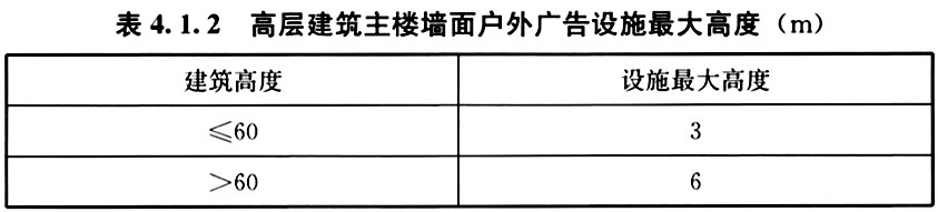 4 高层建筑主楼墙面广告设施宜采用镂空文字或图案等形式,最大高度宜符合表4.1.2的规定。