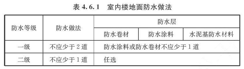 4.6.1 室内楼地面防水做法应符合表4.6.1条的规定。
