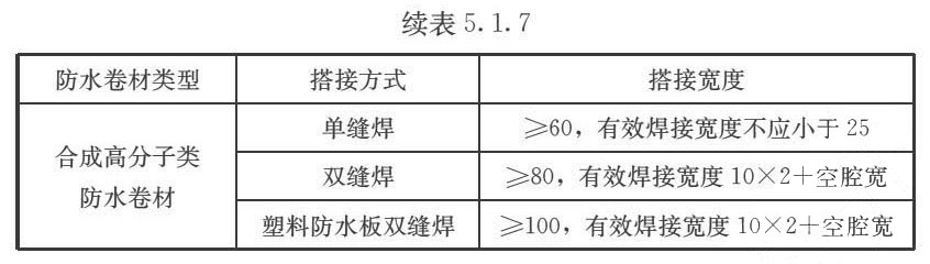 5.1.7 防水卷材最小搭接宽度应符合表5.1.7的规定。